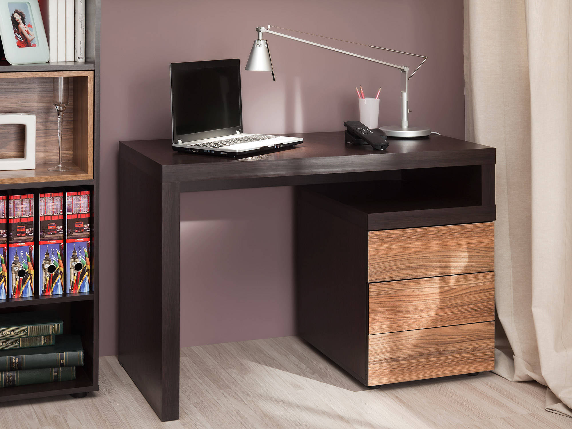 Le modèle, suspendu dans les airs et muni d'arrondis des deux côtés, contribuera à créer une impression de légèreté à l'intérieur, sans le surcharger. Une tablette escamotable pour le clavier aidera à placer un ordinateur sur un tel produit et à laisser un espace libre sur la zone de travail.