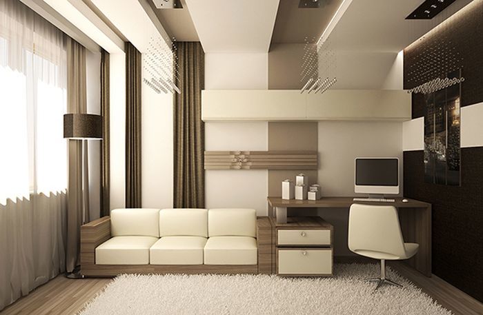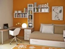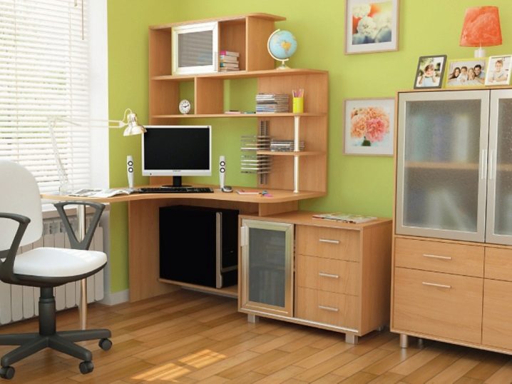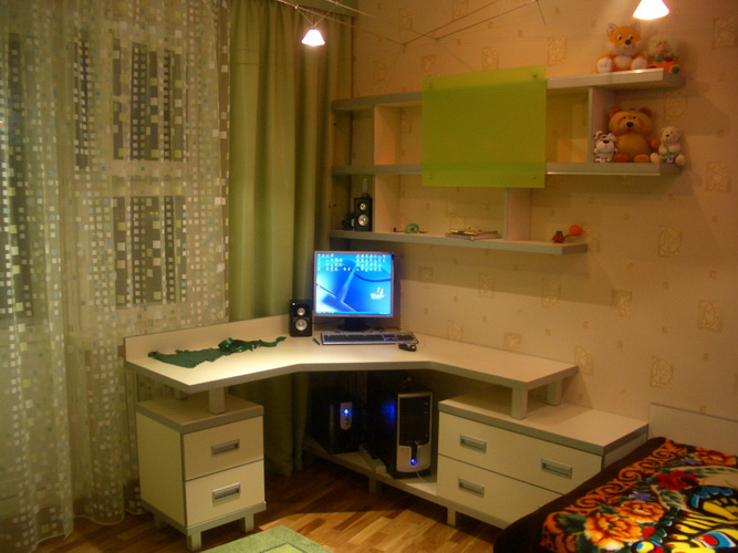 - Le coin peut être aménagé dans une petite pièce de taille: une pépinière ou un petit salon. Ainsi, le coin non utilisé sera occupé et la partie sauvegardée de la pièce sera utilisée par d'autres meubles nécessaires. Le coin de la table peut être réservé pour l'écran d'ordinateur et l'angle sous la table pour l'unité centrale.