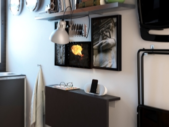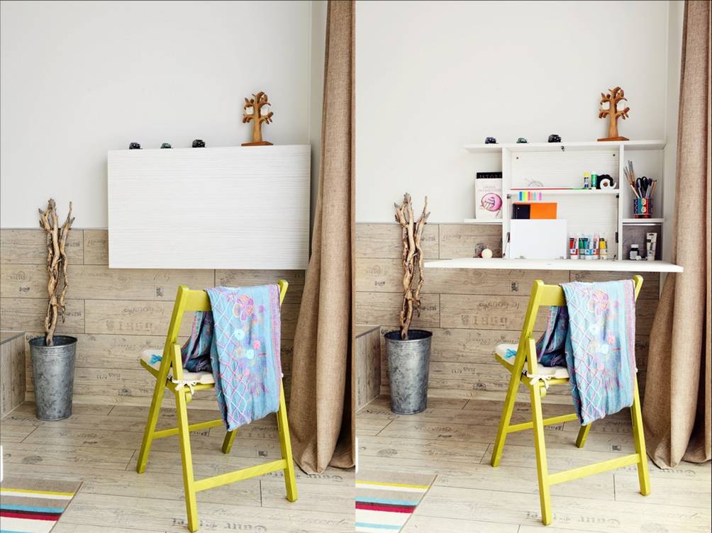 - Le problème d'une petite partie de la pièce peut être résolu par une table pliante. Le dessus de table de ce modèle peut être plié et appuyé au mur s'il n'est pas nécessaire pour le travail.