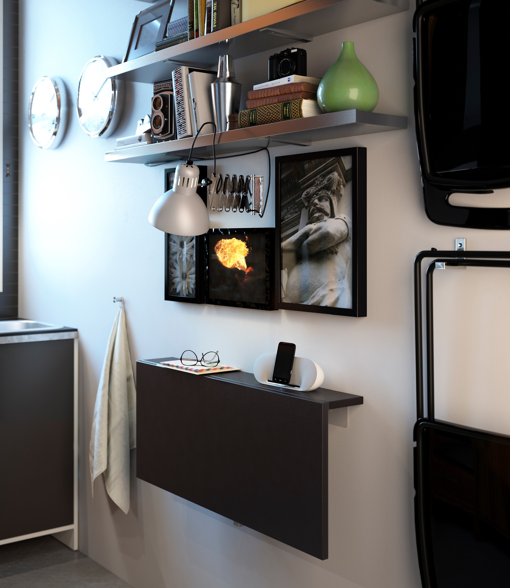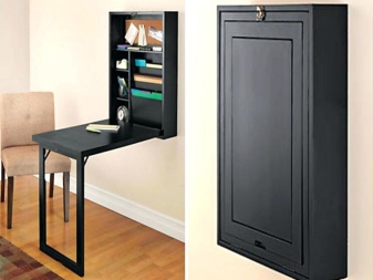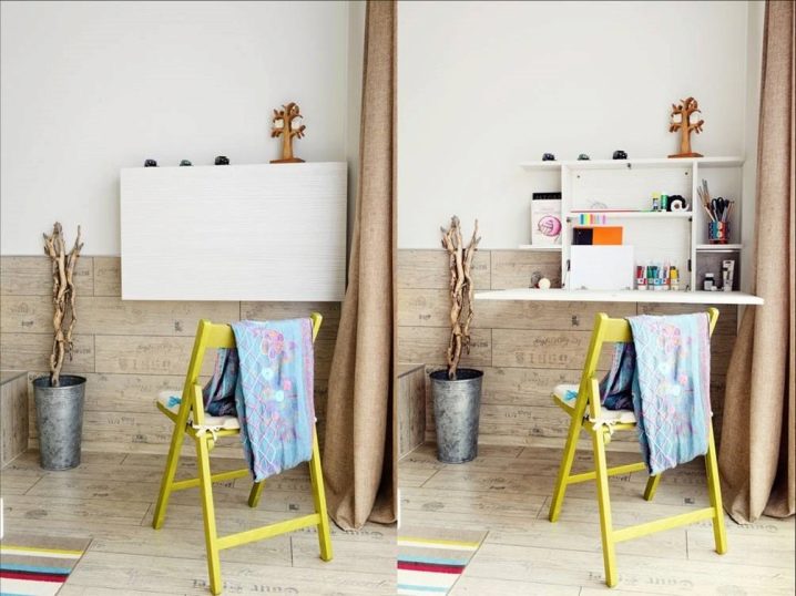 Comme mentionné précédemment, il existe, parmi les modèles les plus récents, des tables pliantes avec fixation au mur. Ils contribueront également à économiser de l'espace dans la chambre ou le salon. Surtout si d’autres meubles suffisent pour ranger des livres et de la papeterie. C'est une option très originale et pratique.