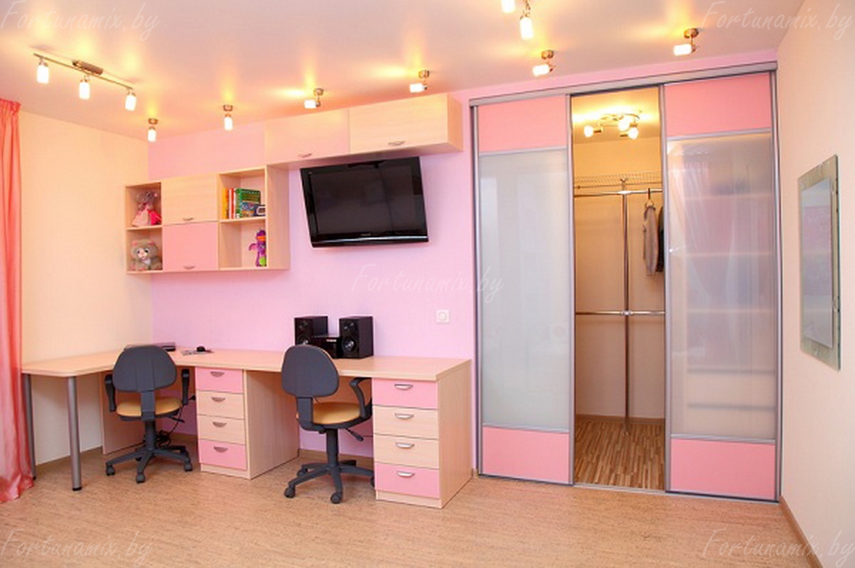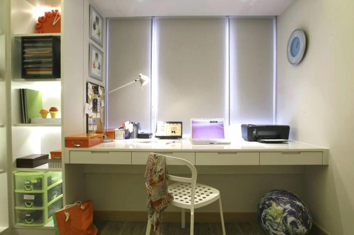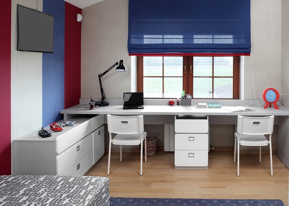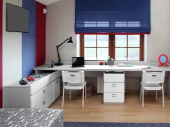 S'il y a beaucoup d'enfants dans la famille (plus de deux), il convient d'installer une longue table dans le mur, dont les zones de travail seront divisées par des cloisons ou des pouces. Une sorte d'option qui peut surprendre.