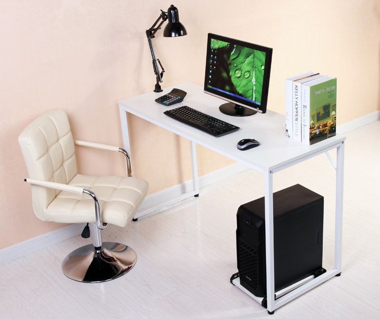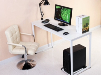 - Une table d'écriture standard est un plateau avec des pieds ou des supports larges. Sur une telle table, il sera commode de placer tout le matériel nécessaire au travail, il y a suffisamment d'espace pour un ordinateur portable et, si vous vous occupez d'une niche pour l'unité centrale, vous pouvez disposer d'un ordinateur.
