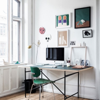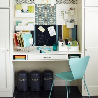 Lors de l'organisation d'un lieu de travail montrer un peu de créativité. Par exemple, au-dessus de la table, vous pouvez suspendre une petite planche magnétique ou en bois. Vous pouvez y attacher des images, des photos, des calendriers, des photos, des notes importantes, des messages de motivation, etc. Sur les étagères ouvertes, vous pouvez loger de petites boîtes colorées ou des paniers en osier (selon le style) pour stocker diverses choses.