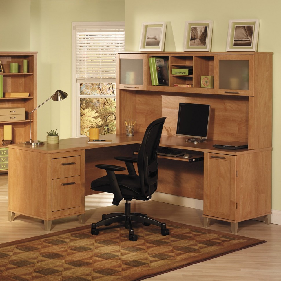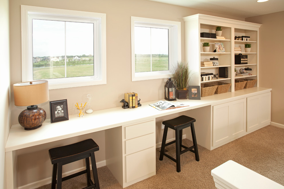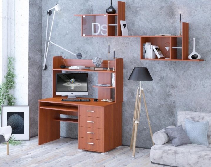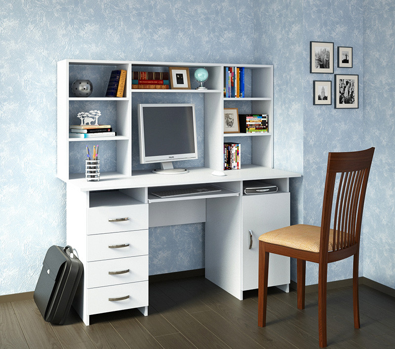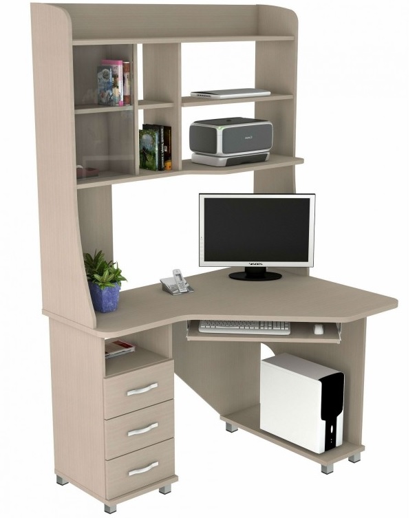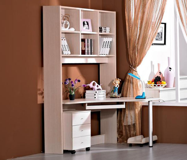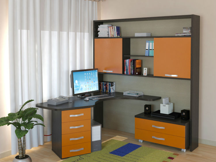 Assurez-vous de disposer d’étagères, de tiroirs et de casiers supplémentaires. Assurez-vous que leur profondeur est appropriée.Il est souhaitable que toutes les étagères soient situées d'un côté. Déterminez si vous avez besoin de niches spéciales pour l’unité centrale, une imprimante, un moniteur ou un ordinateur portable, de la place pour les haut-parleurs, une lampe de bureau. Tout devrait être en place. Celui qui travaille à la table doit d’abord être pratique et à l'aise, tout doit être arrangé de la manière afin de ne pas distraire l'attentionsinon le travail ne sera pas productif.