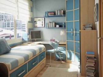 - Des conceptions simples de bureaux avec une armoire peuvent être installées dans n'importe quelle pièce. Elles peuvent être placées même au centre de la pièce. Cependant, les kits volumineux comportant des étagères et des supports suspendus supplémentaires ne peuvent être installés que près du mur.