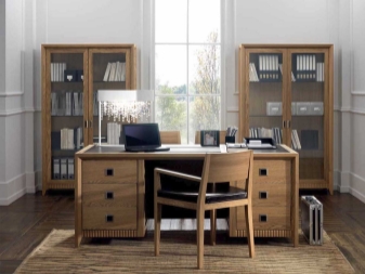 - L'acquisition la plus pratique et la plus pratique est considérée comme un ensemble de meubles avec un bureau, plusieurs socles à roulettes et des étagères. Bien sûr, si l'espace le permet. Avec l’aide de tels meubles, vous pouvez facilement équiper le lieu de travail et le disposer dans le même styleconception.