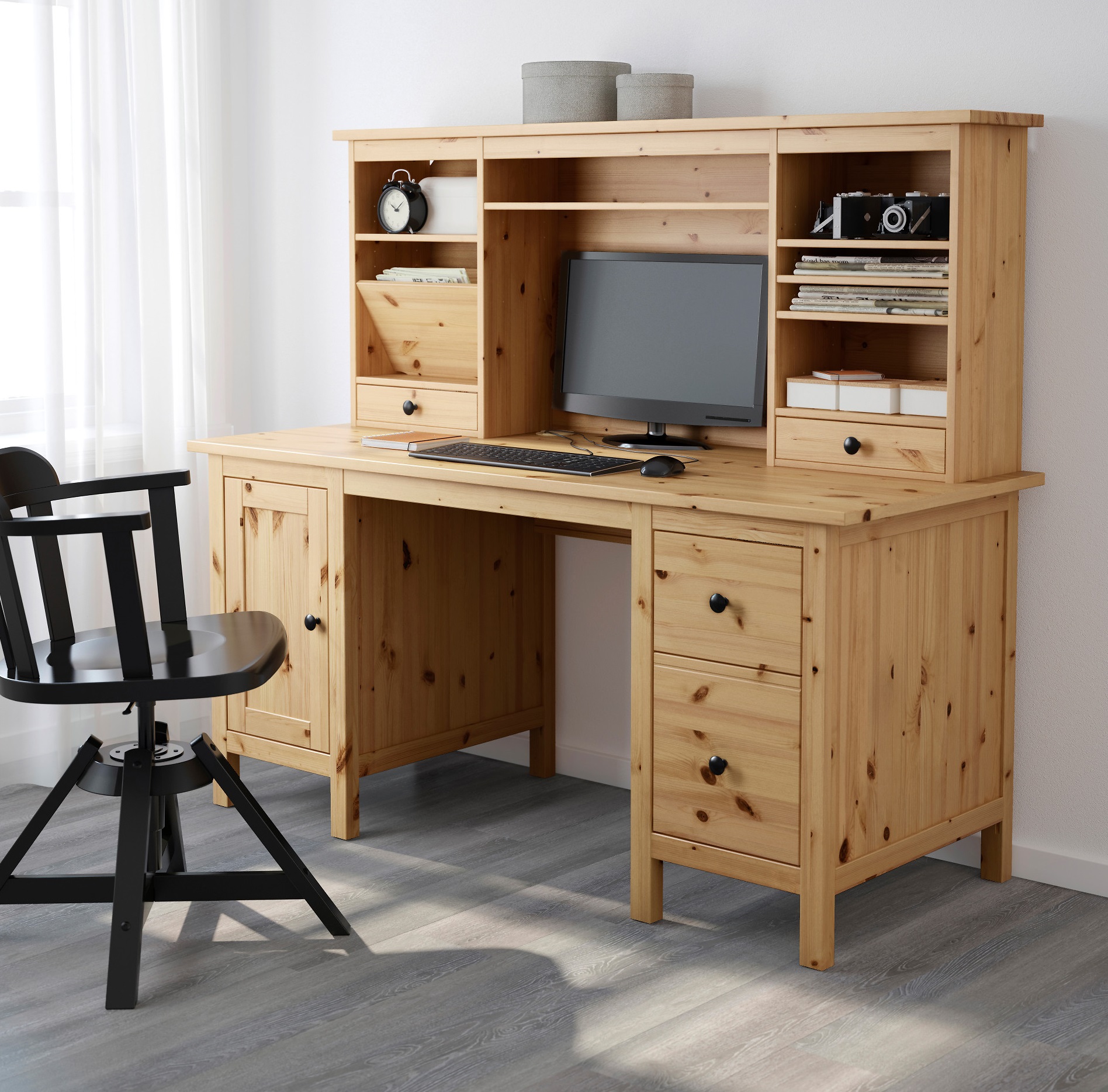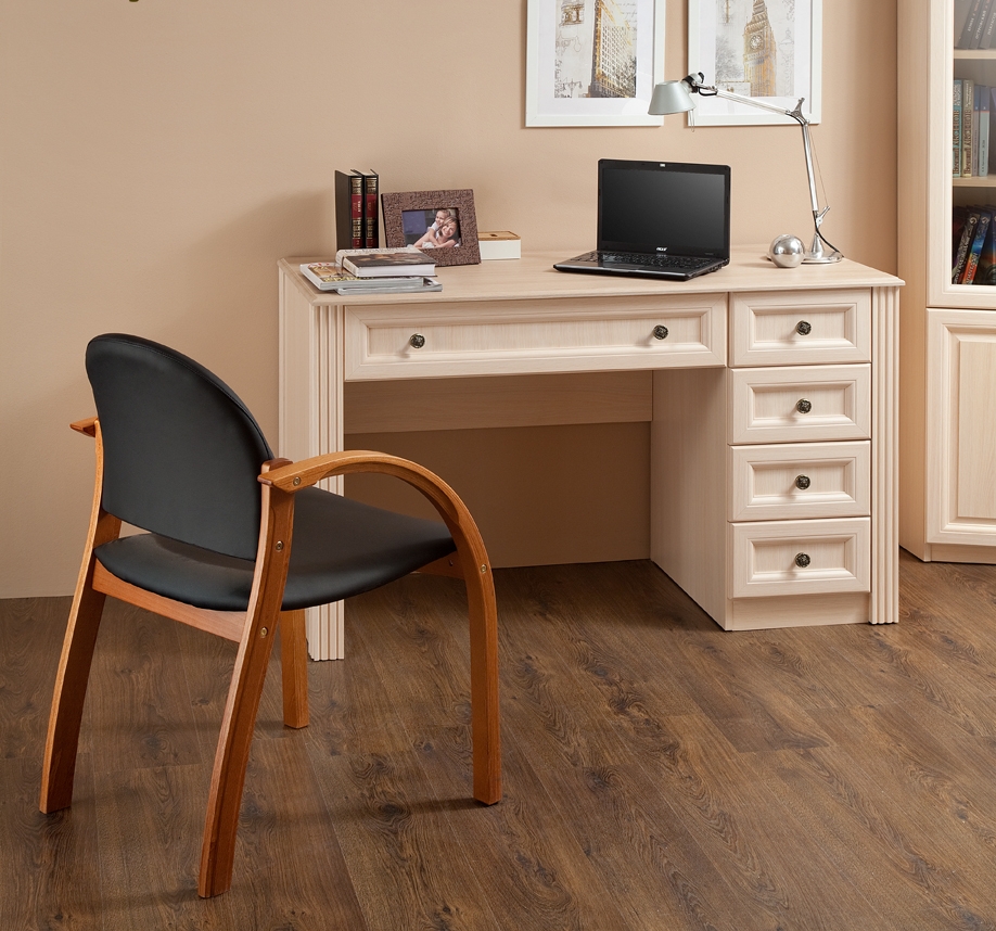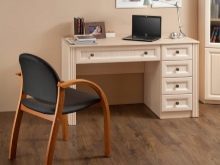 La surface de la table standard est traitée avec une teinture blanche, mais le mobilier peut également être présenté dans des couleurs marron clair et marron foncé. La table est en pin massif, ce qui augmente ses propriétés environnementales. Les câbles d’ordinateur et les rallonges peuvent être dissimulés sur une étagère spéciale sous le dessus de la table.Il y a deux tiroirs et deux étagères fermées. Le design est classique.