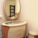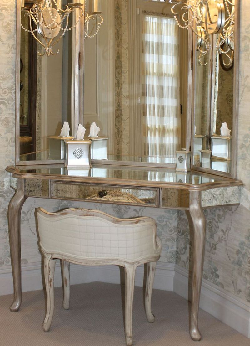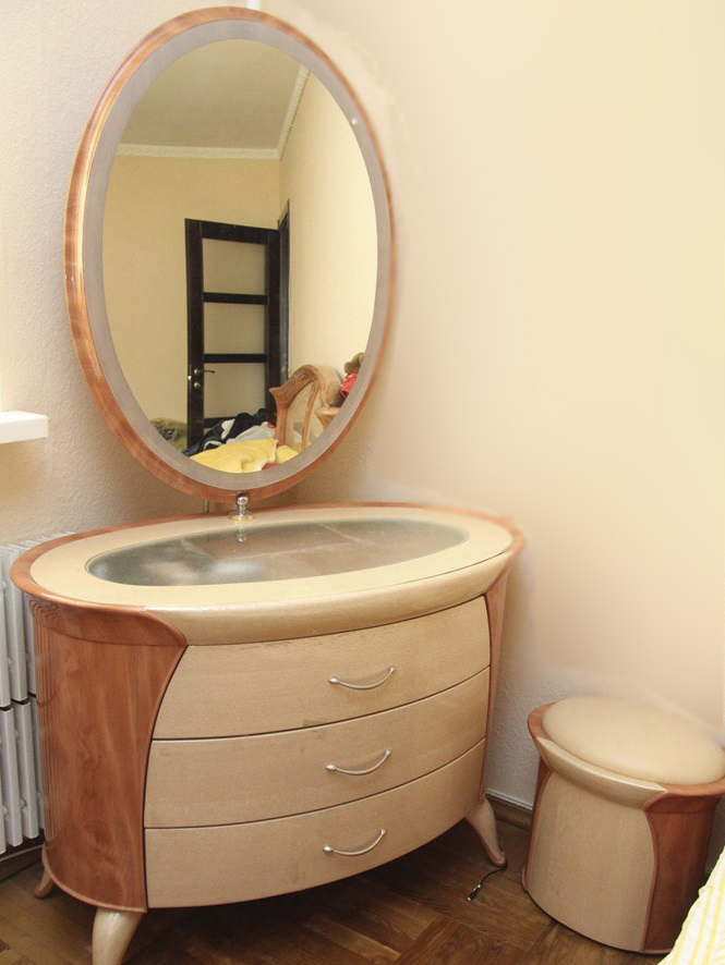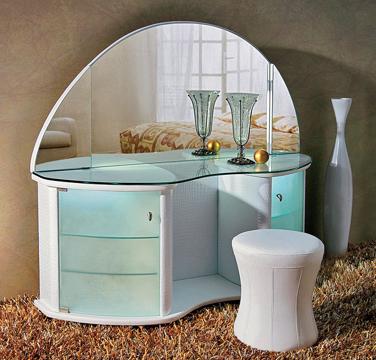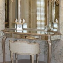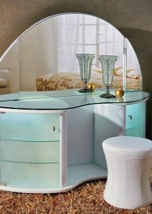 - Verre Auparavant, les modèles en verre ne pouvaient être utilisés que pour le minimalisme. Cependant, les technologies modernes permettent d'obtenir des coiffeuses très intéressantes à la sortie, ce qui constituera un excellent décor pour un style classique.