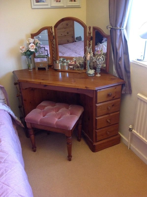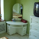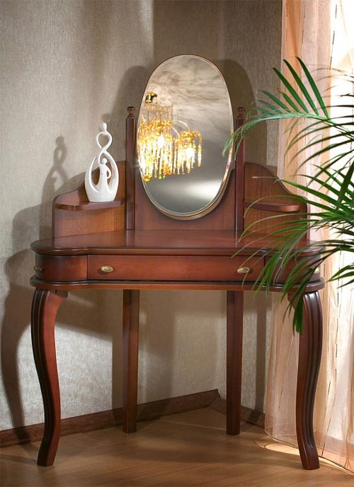 - Arbre Il est considéré comme le matériau le plus populaire pour la production de meubles. L'avantage distinctif du bois est qu'il peut être utilisé pour obtenir une coiffeuse angulaire de n'importe quelle orientation stylistique. Lors du choix d'un tel produit, une attention particulière doit être portée au choix d'une solution de couleur et d'une texture spécifiques. Par exemple, les modèles fabriqués dans le style classique auront fière allure en présence d'une image d'arbre. Pour une chambre à coucher, il est préférable de choisir des meubles aux couleurs riches - cerisier ou frêne;