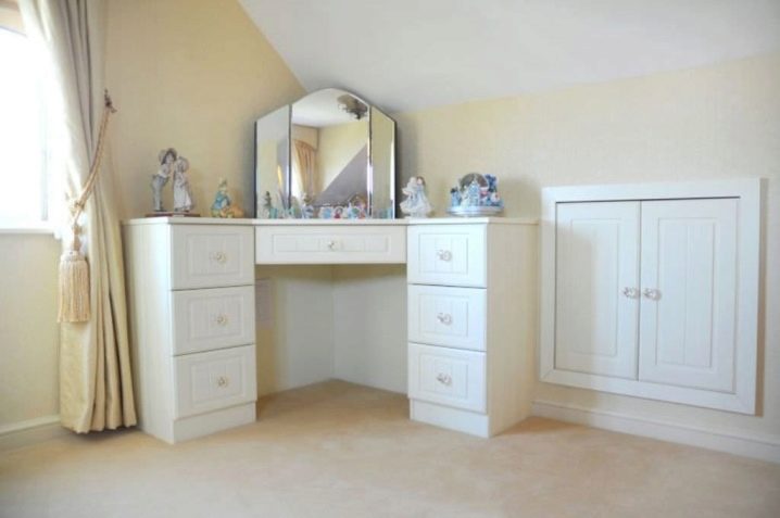 Les zones de coin dans la chambre sont très rarement utilisées. Les psychologues disent que l'angle crée une pression psychologique, à la suite de laquelle une personne tente d'éviter cet espace. L'un des moyens les plus populaires de les remplir consiste à utiliser des systèmes de stockage sous forme d'armoires. L'option idéale serait d'utiliser une coiffeuse pour remplir l'espace du coin. Si la pièce est de petite taille, vous pouvez privilégier les options avec miroir, qui diffèrent non seulement par leurs fonctionnalités, mais permettent également d’augmenter visuellement l’espace.