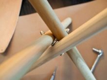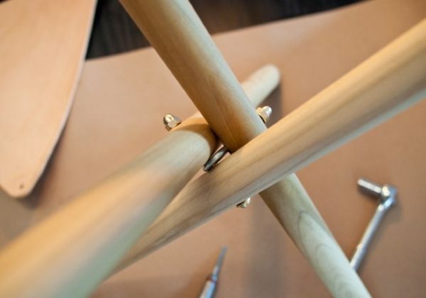 À ce stade du travail, les extrémités supérieures des jambes sont reliées aux traverses par des boulons, sur lesquels il y aura ensuite un siège. Deux traverses sont montées sur les jambes internes et deux sur l'extérieur.