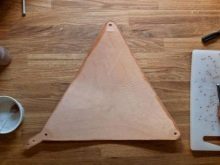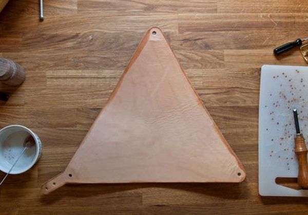 Le siège aura une forme triangulaire et une longueur de 28 cm de chaque côté. Nous coupons le tissu avec des ciseaux et si le siège est en cuir, nous le coupons au couteau. Pour faciliter le transport, il est possible de fournir une chaise avec une ceinture. La chaise peut être portée à l'épaule si vous y attachez une ceinture. Une boucle de montage se fait à l’un des coins de la toile.