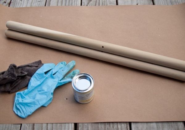 Nous avons coupé 3 futurs pieds dans le matériau sélectionné, d’une longueur de 60 cm, en section transversale de 4 cm, puis nous avons pratiqué des trous de 0,6 cm dans chaque manche, à une distance de 34 cm du bord. Aux extrémités du trou de forage pour fixer le siège. Si vous avez choisi des pieds en bois, faites-les tremper dans de l'huile de lin et de la peinture. Donc, ils dureront plus longtemps.
