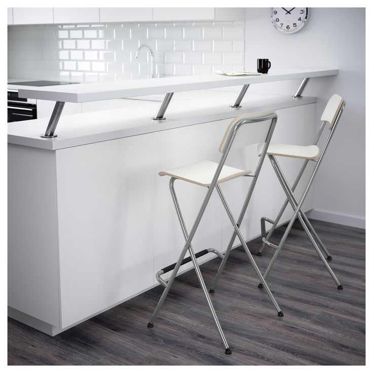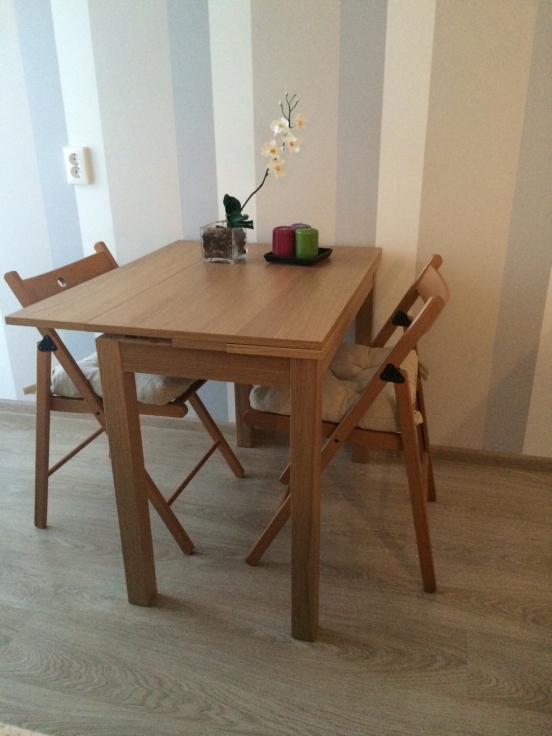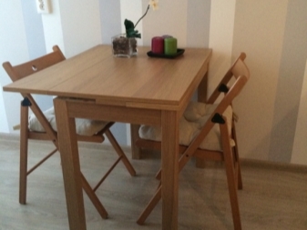 Malheureusement, la disposition de l'appartement ne signifie pas toujours qu'il y a suffisamment d'espace dans la cuisine.Dans ce cas, lors de l'aménagement des locaux, il faut faire face au problème de l'économie d'espace libre. Heureusement, Ikea offre le plus grand choix de modèles de tables et de chaises de cuisine. En cas d’espace insuffisant dans la cuisine, nous pouvons recommander l’option d’acquérir des chaises pliantes compactes. Une variété de modèles et la haute qualité de tels meubles ne sont pas inférieurs aux options classiques.