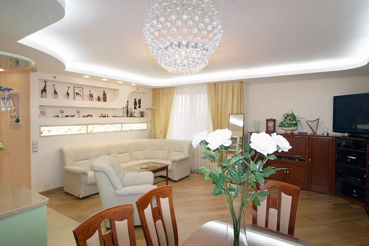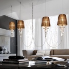 - Vous pouvez également placer le lustre en cristal non pas au centre de la pièce, mais plus près de la fenêtre. Dans ce cas, vous devrez construire des lampes supplémentaires pour un éclairage uniforme.