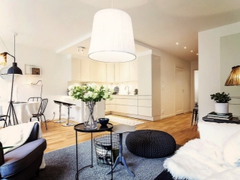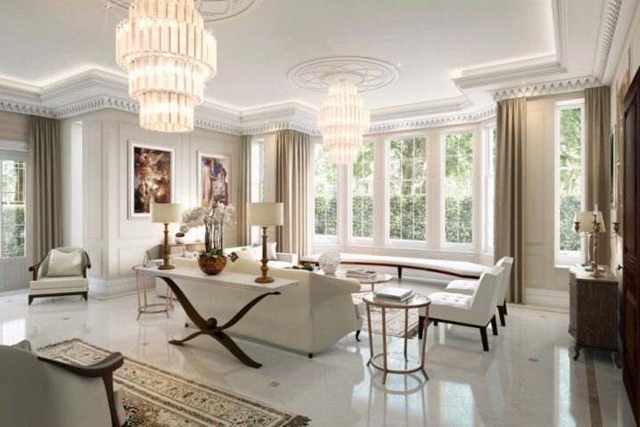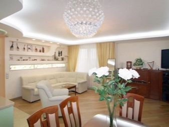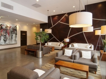 Lors de l'installation, il est nécessaire que le luminaire principal soit complété par des éléments d'éclairage supplémentaires, tels que des bras de lumière, une lampe de sol, des lampes à LED ou d'autres modèles. Ceci est fait pour élargir visuellement l'espace. Dans le cas d'une grande pièce, celle-ci doit être zonée avec de la lumière. Ainsi, il est possible de focaliser l'attention sur l'une ou l'autre partie de l'intérieur.