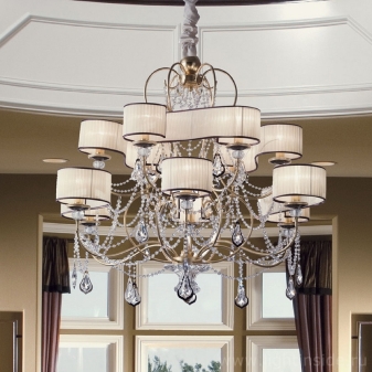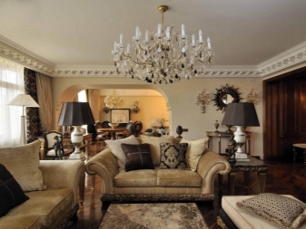- Il est recommandé de suspendre un grand lustre dans une pièce spacieuse. Dans ce cas, des constructions à plusieurs niveaux sont utilisées, ce qui permet d’éclairer l’ensemble de la salle.