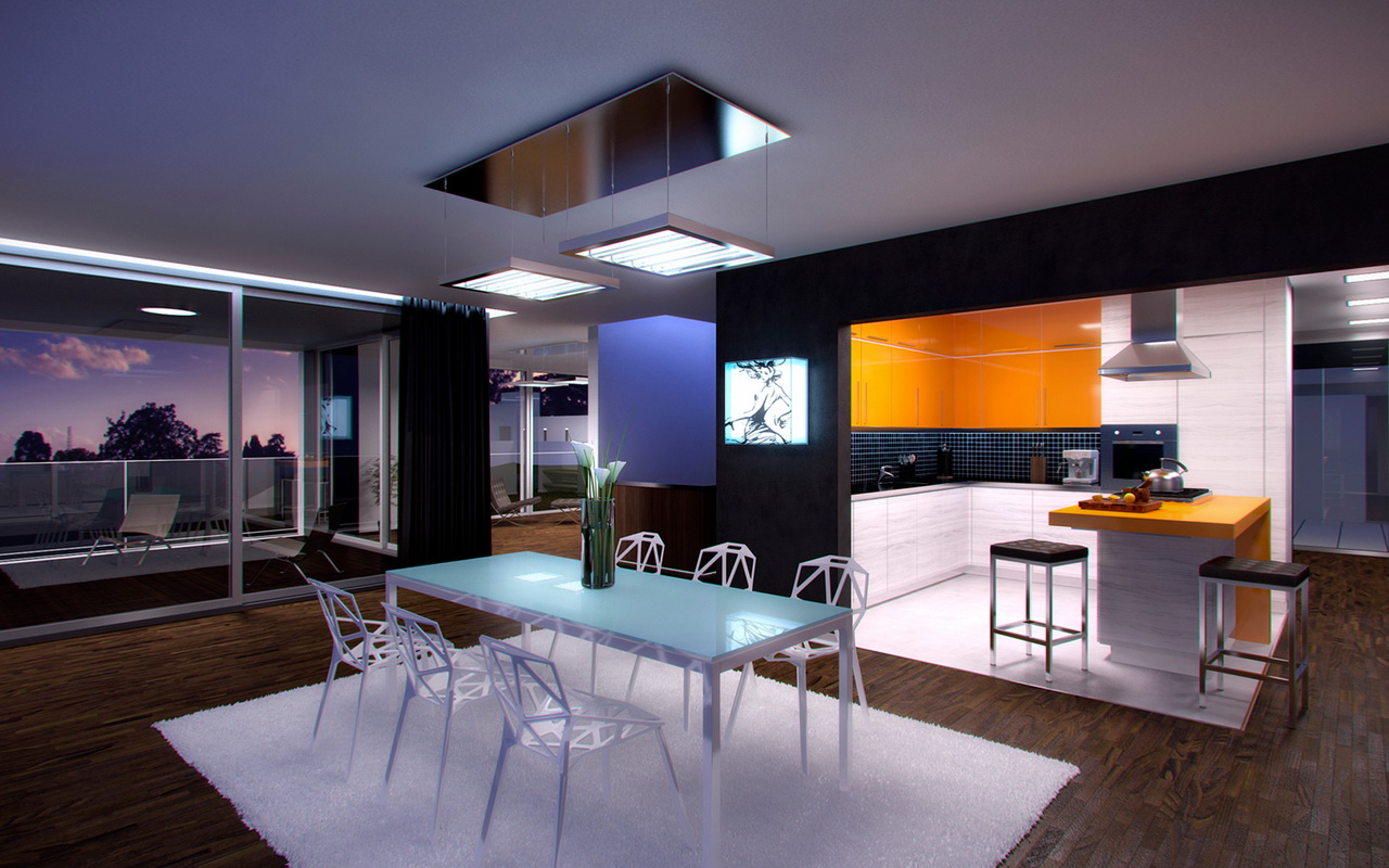 - Haute technologie fait référence à l'un des styles les plus fonctionnels. Il utilise du plastique et du verre. Appliquez des raccords ou des tuyaux pour la décoration. Ces lampes ont souvent plusieurs niveaux et installent des tableaux ou des programmes spéciaux à l'aide desquels la couleur peut changer. La caractéristique principale est le jeu de couleurs, car dans ce type de conceptions, les couleurs et les nuances doivent être dominantes.