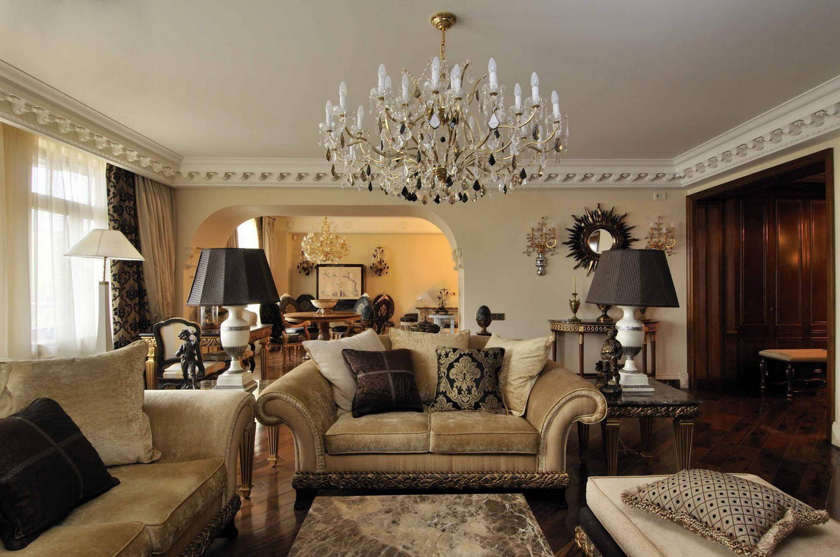 - Dans les classiques les grosses lampes faites de métaux coûteux et de verre sont appropriées. Pour la finition, ils utilisent un grand nombre de petites pièces. Dans leur forme, elles doivent ressembler à des bougies ou à des plafonniers. L'une des variantes de ces modèles est un lustre en cristal. Avec son aide, un jeu de lumière est créé dans la pièce, ainsi qu'un sens de la fête et une ambiance festive.