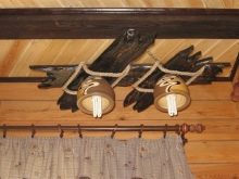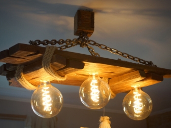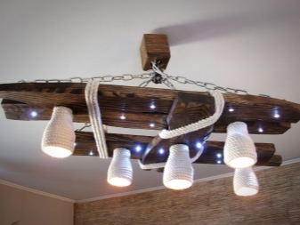 - Suspension de planches sèches et de cordes. Ici, comme sources d’éclairage, quelques teintes ternes et au design très simple. La conception de base de la suspension peut être complétée par tout élément décoratif, selon les souhaits de l'auteur