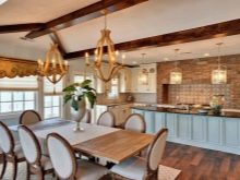 - Poutre en bois avec pots ou lampes. Ceci est un autre modèle original de plafonniers. Une solution de design assez intéressante qui s'adapte à de nombreux styles d'intérieurs;