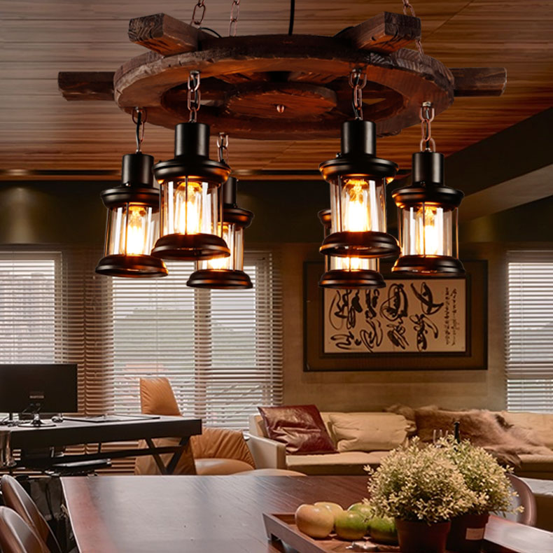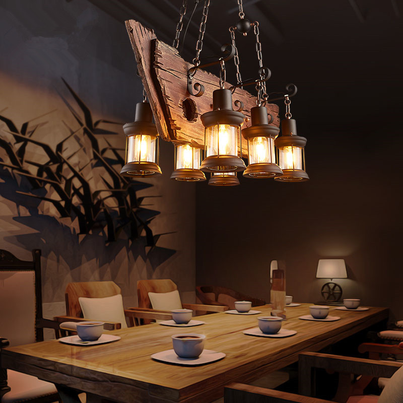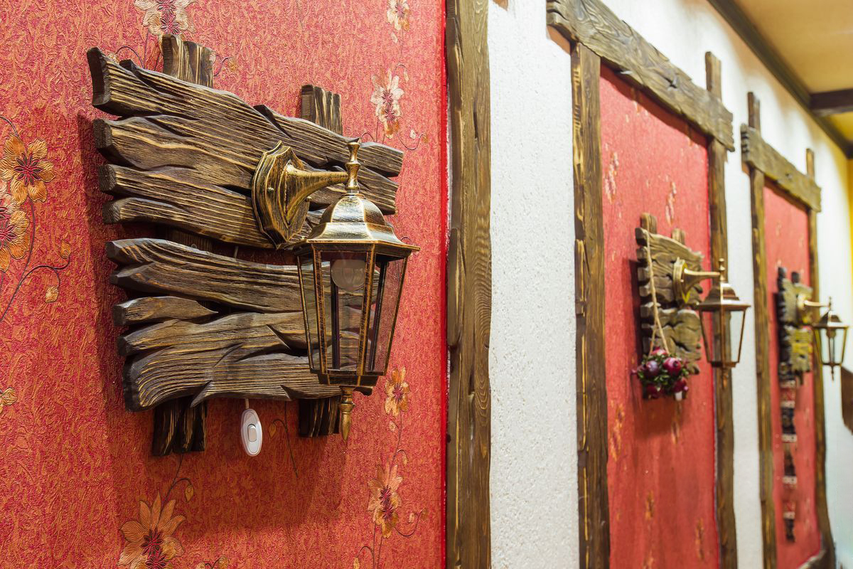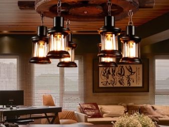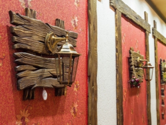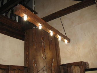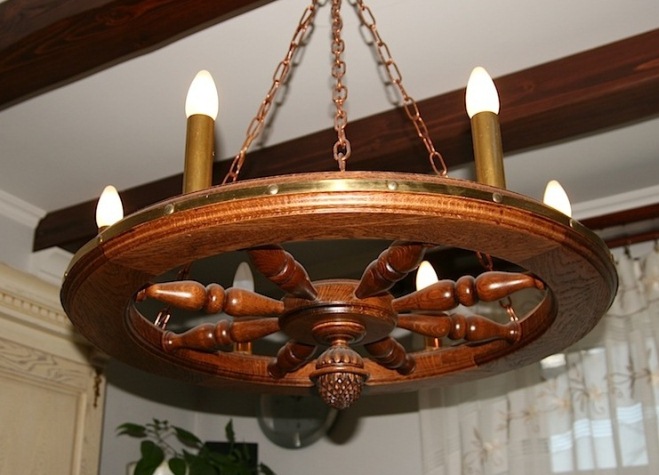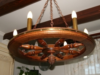 Les dispositifs d'éclairage en bois permettant de créer des intérieurs rétro sont également recherchés. Avec ce détail, vous pouvez vous plonger dans presque toutes les époques. Récemment, les lampes fabriquées sous la forme d '«antiquités» sous la forme d'une roue de chariot, sur lesquelles des lampes en forme de bougies sont disposées symétriquement sur le pourtour, gagnent en popularité.Ce décor est utilisé dans la conception d'intérieurs de maison dans le style du Moyen Âge, ainsi que dans les institutions publiques stylisées (cafés, bars, restaurants, hôtels, etc.).