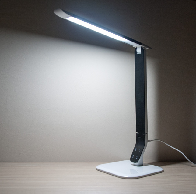 - Avec installation sur une surface horizontale plane. Il s’agit de l’option la plus simple et la plus répandue, ce qui est pratique car il est facile de se déplacer dans la zone de travail, mais c’est aussi la moins fiable en termes de dommages mécaniques.Une telle lampe est facile à pousser ou à laisser tomber, et la probabilité qu’elle ne souffre pas est une grande question;