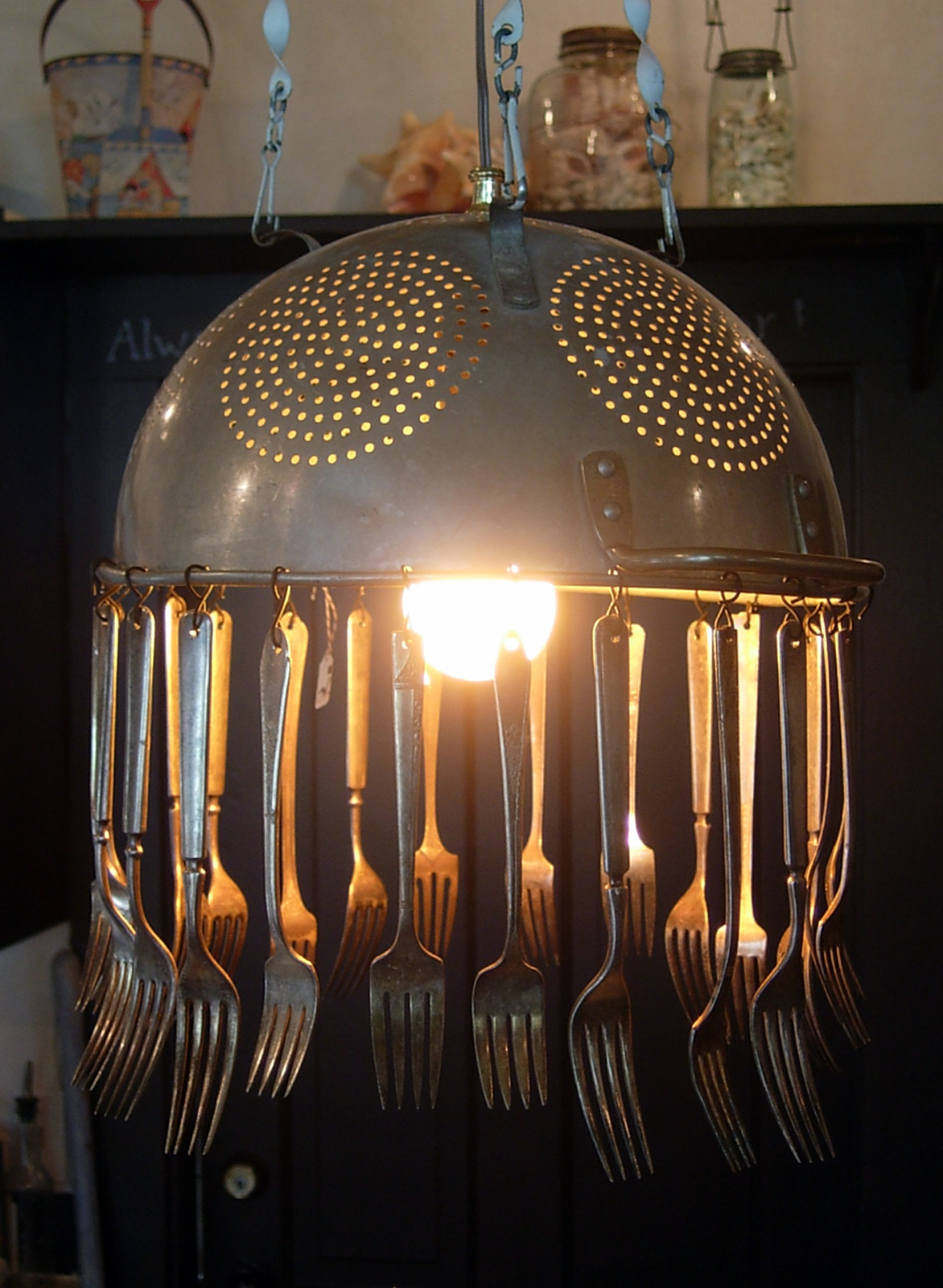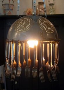 - Un autre dispositif intéressant - des ustensiles de cuisine: passoire et couverts. Avec cela, vous pouvez parfaitement décorer la salle à manger de la cuisine.