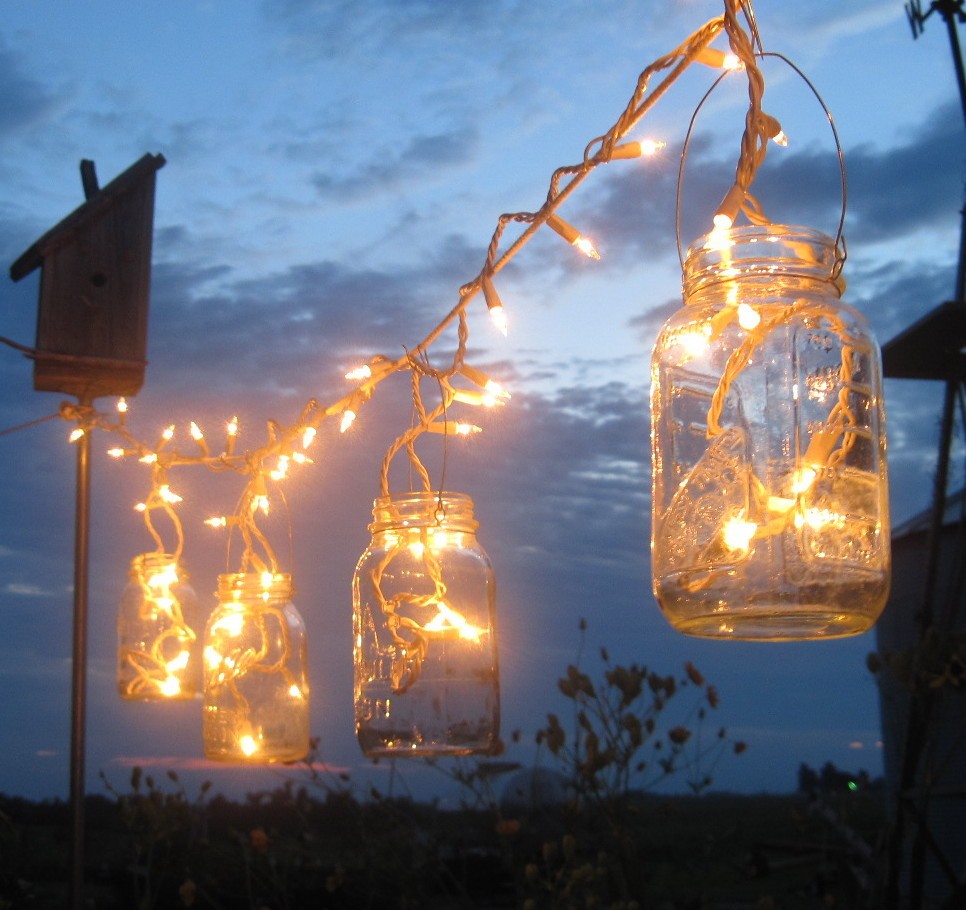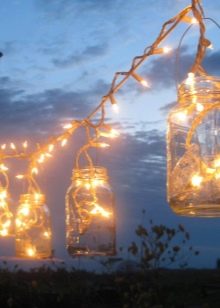 - La lumière de jardin peut simplement être faite de guirlandes et de bocaux en verre, suspendu sur un fil. La version originale pour la fête pays.