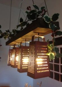 - Luminaire fabriqué à partir de râpesCela ira bien dans la cuisine.C'est un modèle assez original qui met l'accent sur le centre de cette pièce. Un tel dispositif d'éclairage est adapté pour être placé dans un style loft.