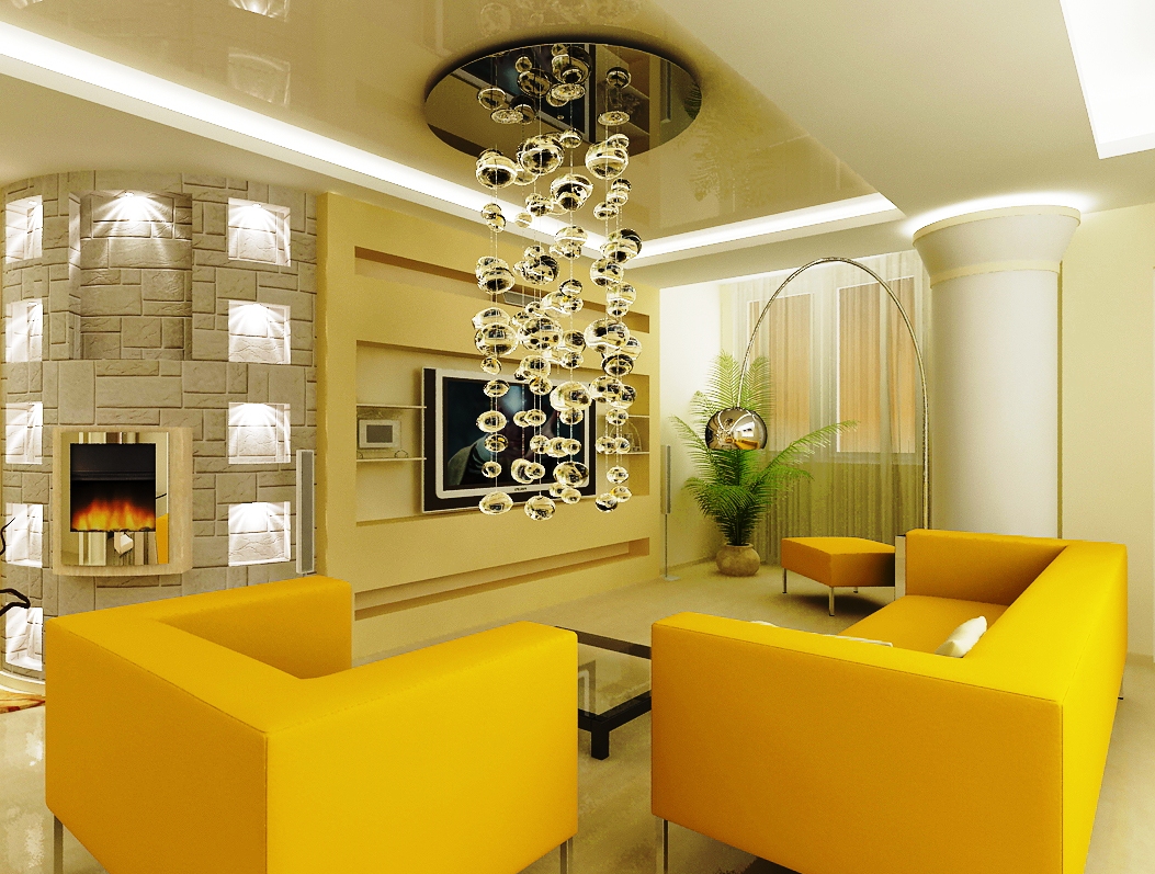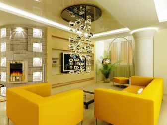 - Dans le salon Le plafond est l’endroit le plus important pour une lampe inhabituelle. Lustre design en un seul exemplaire sera une belle décoration de cette pièce. Les appliques originales pourront surligner la zone du canapé ou surligner la photo.