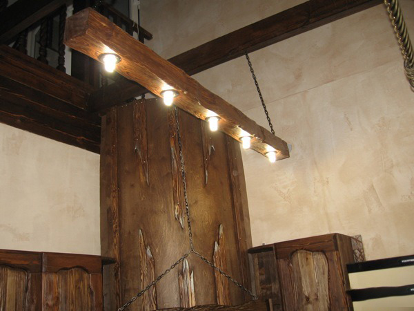 - Lustre sous la forme d'une poutre avec des lampes adaptées à la salle, décorées dans un style médiéval. Une telle lampe ajoutera à l'élément intérieur de brutalité.