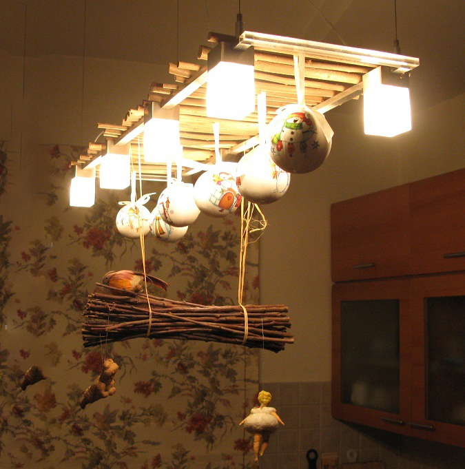 - Lustre pour le salon ou la salle à manger dans un style campagnard peut être fait à partir de branches d’arbres, conçues sous la forme d’un nid. Les ampoules peuvent être décorées avec des éléments en bois sous forme de bougies.
