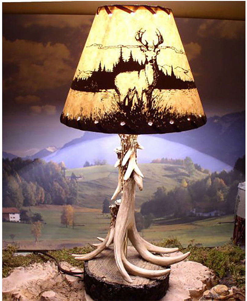 - Support de lampe de nuit effectué des bois de cerf. L'abat-jour est également décoré à l'image de cet animal. Cette lampe est parfaite pour décorer un pavillon de chasse.