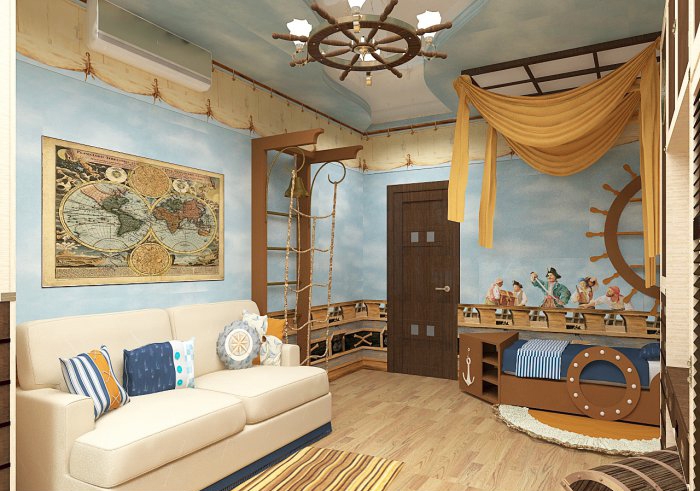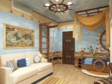 Dans la pépinière, vous pouvez également utiliser une variété de couleurs différentes. Pour la chambre du bébé, vous devez choisir des couleurs rose, cramoisi, écarlate, pour le bébé - bleu, bleu, émeraude, marron. En outre, les modèles en bois sont parfaits pour la pépinière, ils sont respectueux de l'environnement et s'intègrent facilement dans une pièce, par exemple un style de pirate.