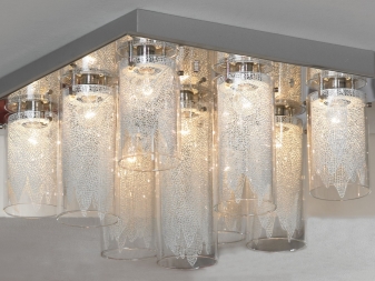Selon le nombre de plafonniers, il peut y avoir des lustres pour un plafonnier et plusieurs, en fonction de cela, la luminosité du flux lumineux sera également ajustée et l'apparence du lustre changera.