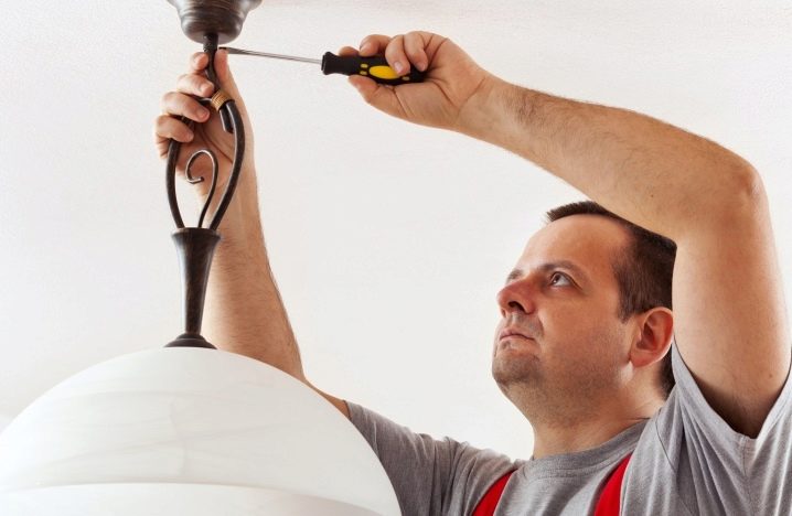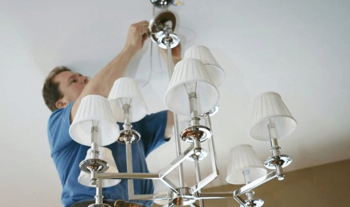 Avant d'installer ou de retirer le lustre, vous devez vous assurer que l'interrupteur de la lampe est éteint. Les luminaires fonctionnant à partir du réseau, il vous suffit de vous déconnecter de celui-ci, mais avec les plafonniers, il ne suffit pas de couper le courant, il est parfois nécessaire de mettre tout le réseau hors tension. Cette solution aidera non seulement à sécuriser le maître, qui installera le plafonnier, mais également à éviter les chutes inutiles d’électricité sur le réseau. En cas de doute sur le fait que l'électricité est coupée, vous pouvez la vérifier avec un outil avec un indicateur de tension.S'il n'émet pas de signal lumineux, cela signifie que le lustre est complètement hors tension et que tout contact avec ses parties devient absolument sans danger.
