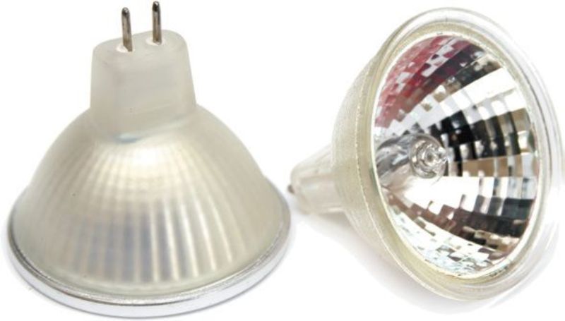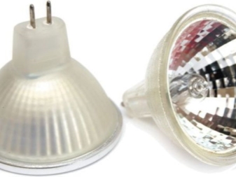 - Lampes halogènes. Représenter les ampoules à incandescence avec un diffuseur de verre de quartz. Ils brûlent beaucoup plus brillamment que les deux options précédentes, ont une efficacité plus élevée. Avantages: une large gamme de modèles, la possibilité de créer des rayons directionnels, de petite taille. Inconvénients: ils deviennent très chauds, ils servent moins que les lampes fluorescentes, ils ne permettent pas le contact du sébum avec le verre de quartz.