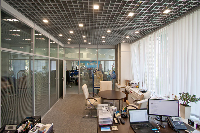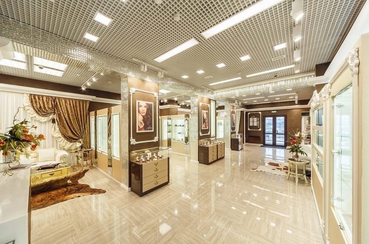 Tous les systèmes d'éclairage ne conviennent pas à une conception de plafond grilyato inhabituelle. Fondamentalement, il est utilisé dans les centres commerciaux, car il cache en réalité trop d’espace, ainsi que du "rembourrage" technique, généralement situé dans des lieux publics au plafond.