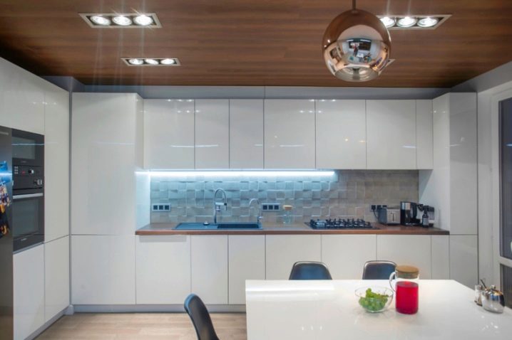 Pratiquement tous les types de plafonds, y compris les lattes rares et les multiniveaux populaires, conviennent à l’installation d’ampoules encastrées. Les projecteurs peuvent être intégrés à la surface même du plafond et au-dessus lorsque le plafond ne contient que la partie électrique.