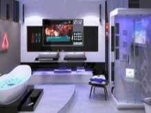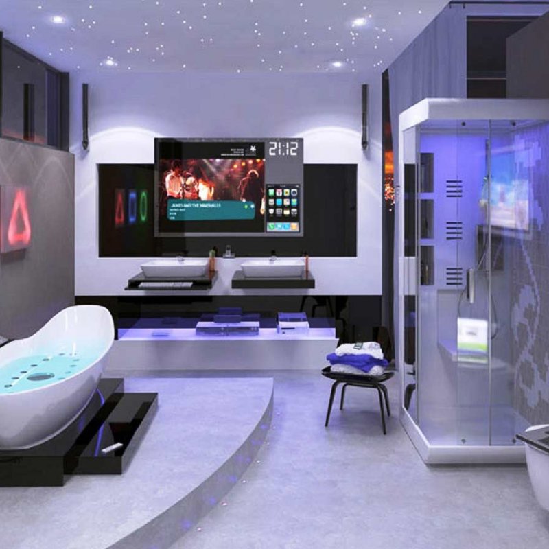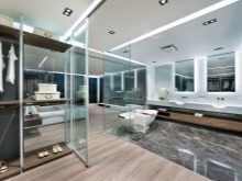 Une option intéressante serait le design de la salle de bain dans le style de la haute technologie. Les particularités de l'éclairage dans cette direction incluent l'abondance d'éléments métalliques, des lignes claires. Ces produits ne sont pas non plus caractérisés par un décor créatif. Des surfaces brillantes aideront à mettre en valeur le style. Quant à la forme, il peut s'agir à la fois de versions rondes et de trapèzes. Cependant, le lissage n'est pas inhérent à toutes les lignes.