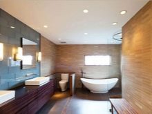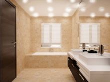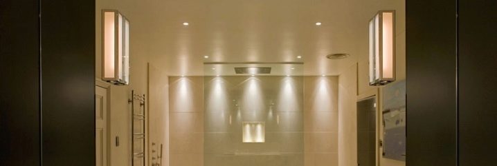 - Plafond. De telles options sont assez courantes dans les salles de bains modernes. Ils sont capables de donner une lumière douce et agréable qui sera confortable pour les yeux. Ils assureront également une sécurité maximale, car ils seront situés assez haut. Tous les modèles sont fabriqués conformément aux technologies modernes et aux tendances de l'intérieur. Lors du choix d'un tel produit, vous devez particulièrement examiner ses paramètres, car la zone d'éclairage de l'appareil en dépend.