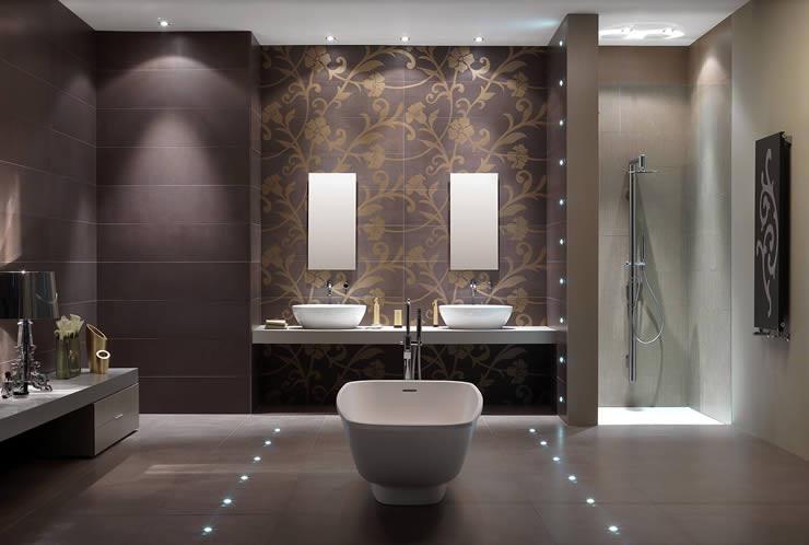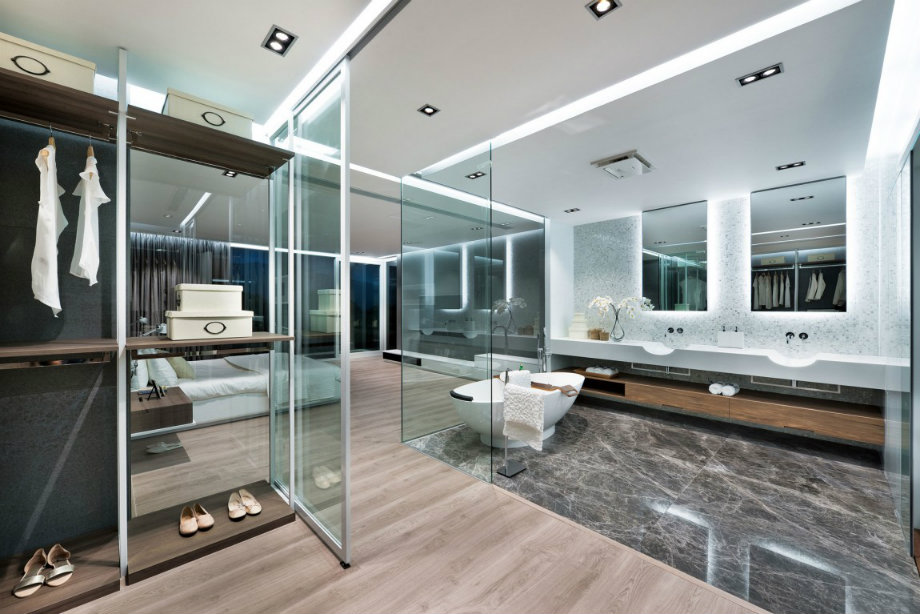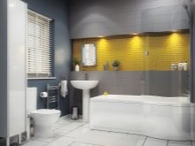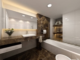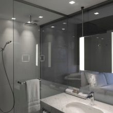 Avant d'acheter un projecteur, vous devez choisir leur emplacement. Tout dépendra du type d'éclairage dont vous avez besoin. Vous pouvez suspendre des options au miroir en mettant cette zone en surbrillance, et vous pouvez organiser les produits sur les murs et au plafond. La disposition dépend également du concept de style incarné dans votre salle de bain.