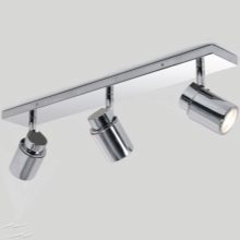 - Frais généraux ou spot. Ces projecteurs de salle de bains conviennent exclusivement aux hauts plafonds. Dans les pièces basses, ils ne seront pas particulièrement harmonieux. Ces produits sont conçus pour la lumière directionnelle, ainsi que pour mettre en valeur une partie de la pièce. Ils sont généralement installés dans la salle de bain près de la coiffeuse avec un miroir.