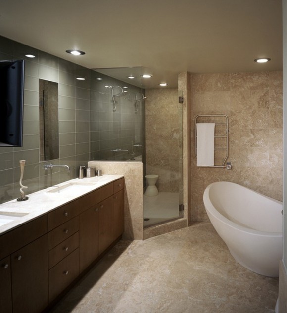 - Intégré. Si votre salle de bain a un plafond bas ou une petite surface, ne désespérez pas. Les sources lumineuses étanches intégrées aideront à donner du style et de la beauté à la pièce. Les produits possèdent le boîtier continu dans lequel sont intégrés l’attache et une pince pour lampe. Cette configuration est assez simple. C'est l'un des avantages des éclairages intégrés.Vous pouvez attacher des modèles sur n’importe quelle surface. Vous pouvez choisir à la fois des options fixes et rotatives.