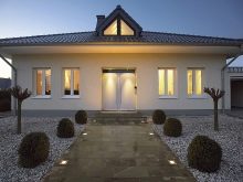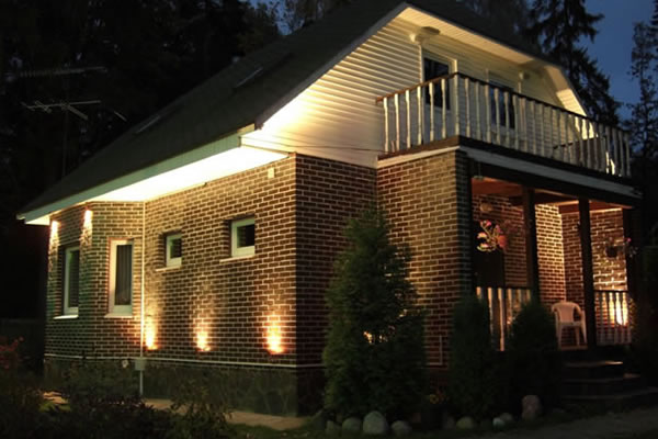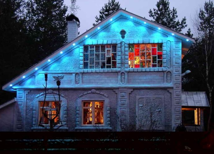 Si nous parlons d'une vieille maison dont la façade est assez défoncée par le temps, tous les défauts contribueront à masquer les lampes, insérées imperceptiblement dans le toit à la même distance. Si la maison est petite, il suffira d'une lampe, encastrée dans le coin du toit et située à un certain angle.