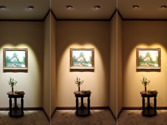 Les dispositifs de downlight à LED sont considérés parmi les plus efficaces. La conception de l'équipement ne diffuse pas la lumière dans toutes les directions, mais bien dans une direction, ce qui est bien adapté à la mise en valeur d'un élément particulier de l'intérieur (image, rack et autres structures).