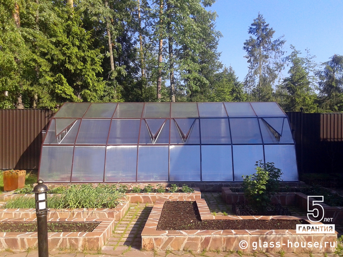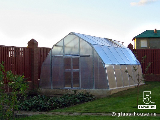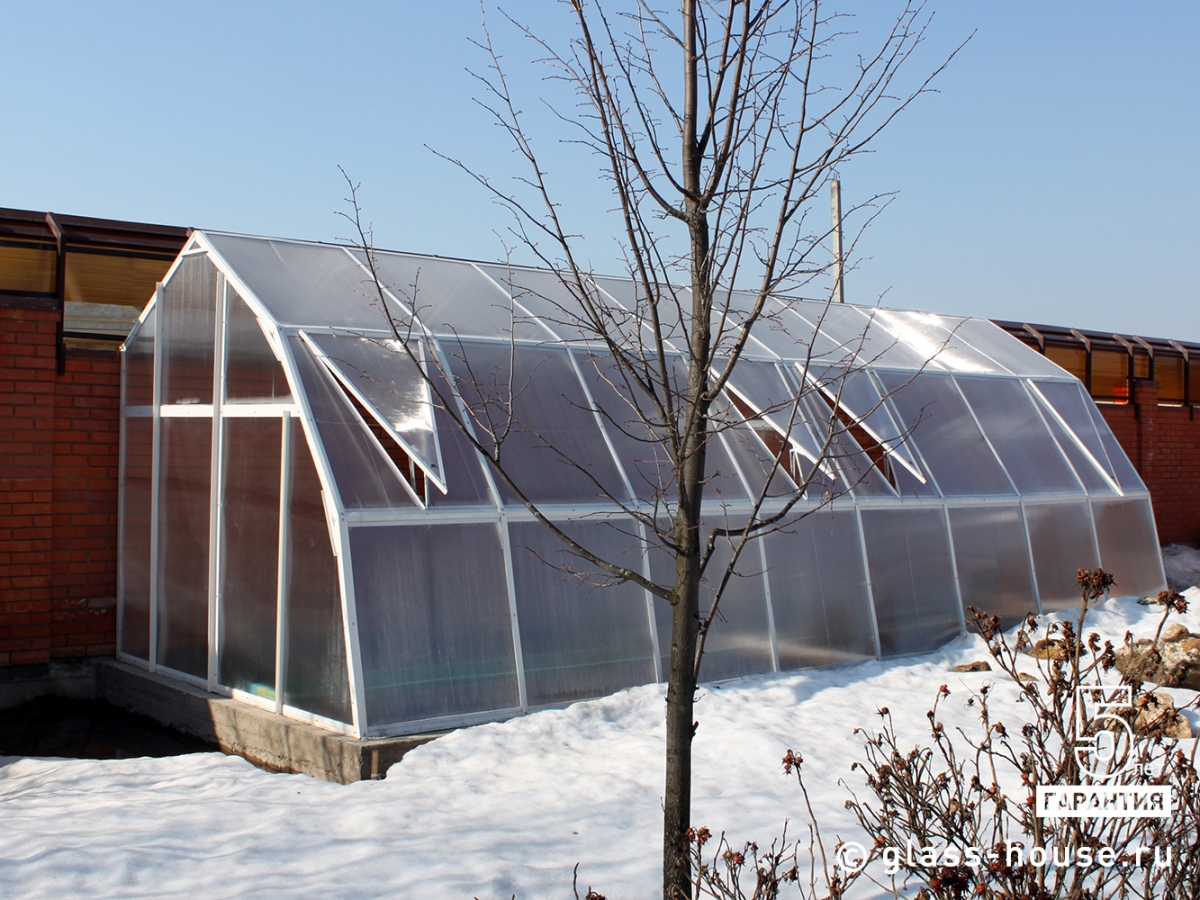 La forme du coin utilisée en production permet d'éviter l'accumulation de condensat sur les pièces. Toutes les serres Glass House sont équipées d’une arête sur le toit, placée à un angle de 120 °, qui évite l’accumulation de grandes masses de neige sur la serre. La porte coulissante de type «coupé» a été utilisée comme porte d’entrée, ce qui facilite grandement l’utilisation de la serre. En raison de la présence de bouches d'aération, situées dans la pente supérieure de tous les modèles, vous pouvez ajuster avec précision le mode de ventilation.