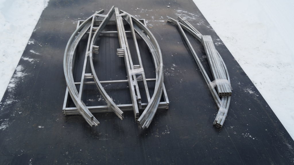 La fixation de la dernière partie cintrée,les cavaliers doivent être installés sur la partie finale. Leur profil diffère généralement dans la section de 20x20 mm, car dans ce cas, le niveau de charge est très faible. Fixant les matériaux de revêtement, ils créent les ouvertures nécessaires pour les fenêtres et les portes. Il est important de traiter tous les joints formés avec un composé de silicone afin d'obtenir une étanchéité maximale.