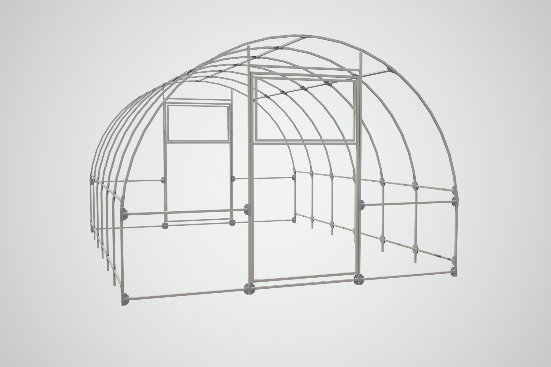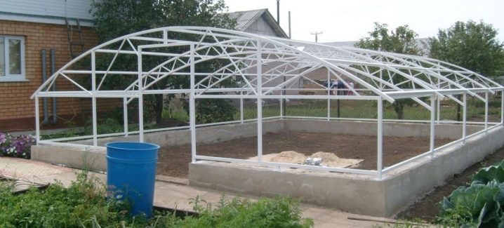 Le composant principal de cette serre est un squelette robuste de tuyau profilé. C'est une base de support rigide pour la consolidation du revêtement sélectionné, qui protégera la plantation des facteurs extérieurs négatifs. Les fondations du cadre de telles érections sont également réalisées indépendamment. La tâche principale de ces travaux est de fournir les attaches les plus fiables pour des éléments individuels.
